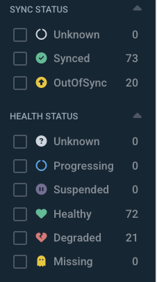 - Healthy Status는 Application이 관리하는 리소스들의 상태 체크(ready/rollout/오류 등)을 종합한 값입니다.