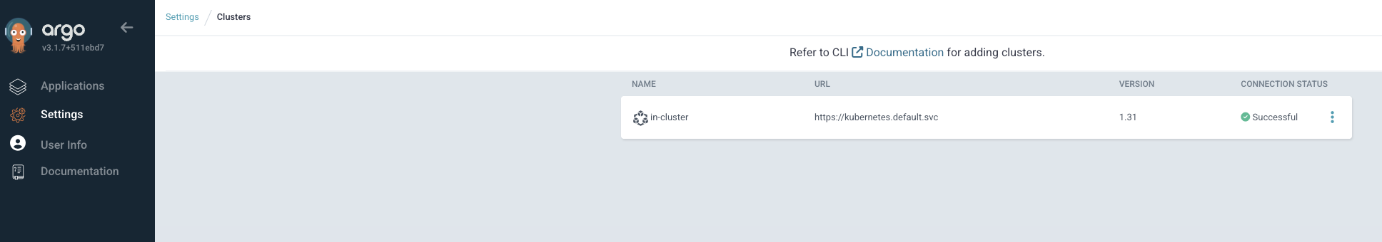 ArgoCD를 배포하게 되면 배포된 클러스터는 자동적으로 Clusters에 등록되고 멀티 클러스터를 배포하려면 타 클러스터는 등록하고 사진과 같이 Successful이라고 접속 상태가 나와야 ArgoCD에서 대상지로 배포할 수 있게 됩니다.