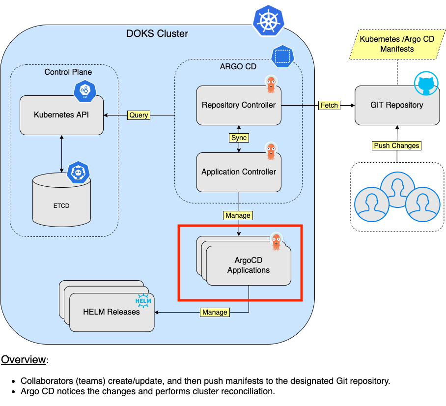 하단의 사진은 ArgoCD의 동작원리를 보여주는 사진 중 캡처해 온 것이며 여기서 빨간 박스에 위치한 Application은 실제 배포를 담당하는 부분을 보여준다고 할 수 있겠습니다.